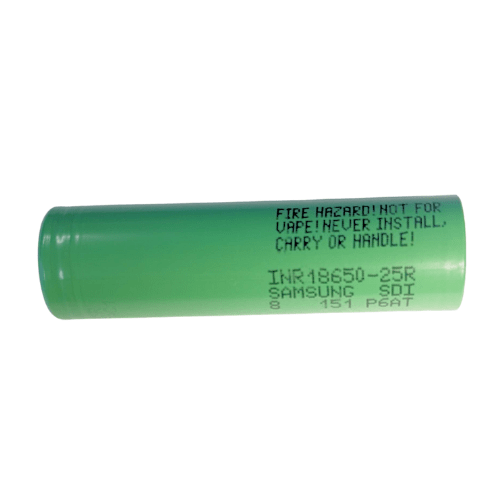 Batería Samsung 25R 18650 Li-ion de 2500mAh y descarga continua de 20A. Ideal para vapeo, linternas potentes y packs de alto consumo energético.