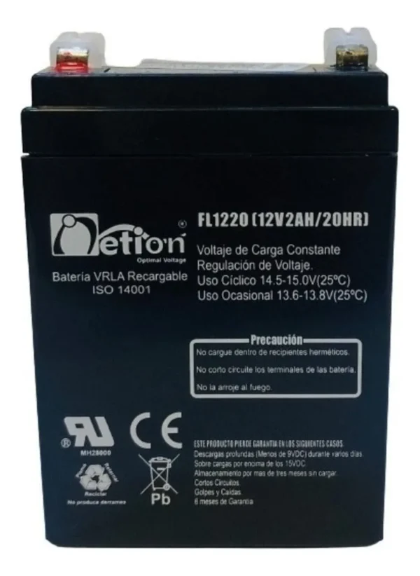 Batería NETION SML 12V 2Ah con tecnología AGM. Ideal para alarmas, luces de emergencia y dispositivos electrónicos. Compacta, segura y libre de mantenimiento.