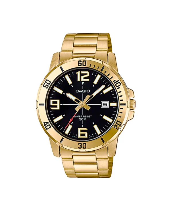 El Casio MTP-VD01G-1BVUDF es un reloj robusto con correa de acero dorado y esfera negra, perfecto para un look elegante y versátil.
